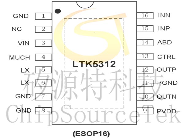 另外由于采用DRC(Dynamic rangecontrol)技术,降低了大功率输出时,由于波形切顶带来的失真,相比同类产品,动态反应更加出色。 LTK5312采用ESOP-16或者SOP-16封装。