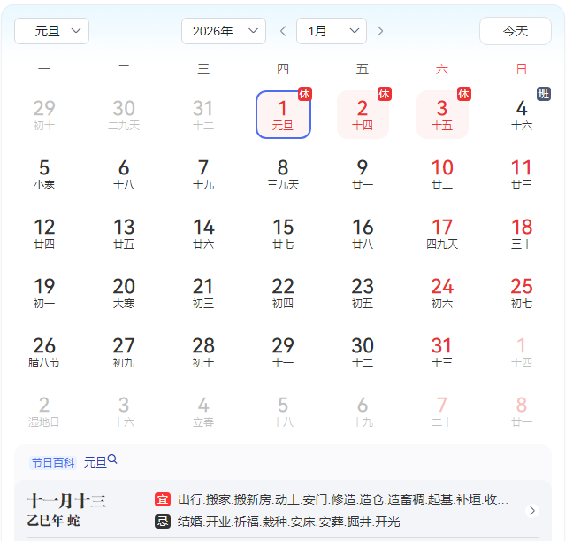 根据国务院办公厅发布的 2026 年部分节假日安排通知,2026 年元旦1 月 1 日(周四)至 3 日(周六)放假调休,共 3 天,1 月 4 日(周日)上班。