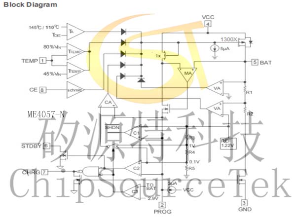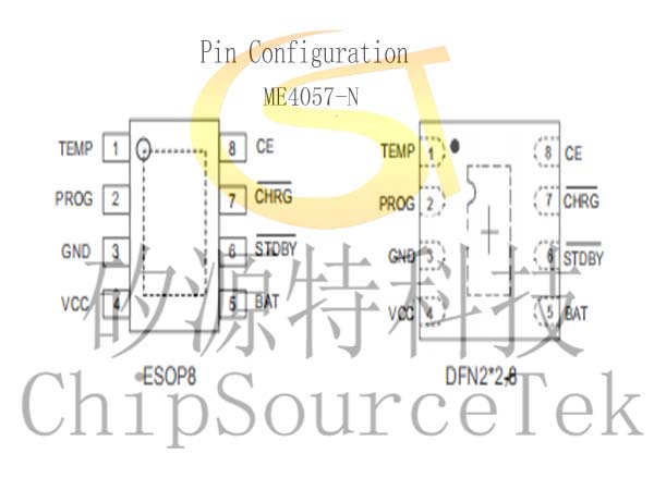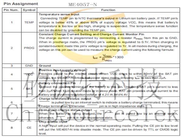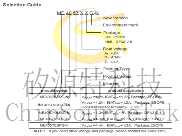 ME4057-N is a complete constant-current/constant voltage linear charger for single cell lithium-ion batteries.With a thermally enhanced 8-PIN SOP package on the bottom and low external component count make the ME4057-N ideally suited for portable applications. Furthermore the ME4057-N is specifically designed to work within USB power specifications.