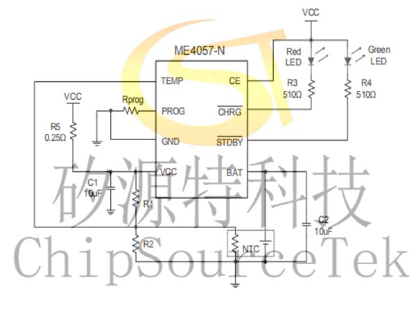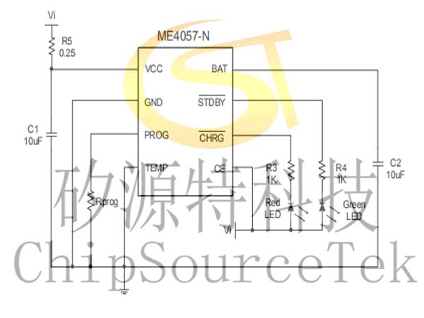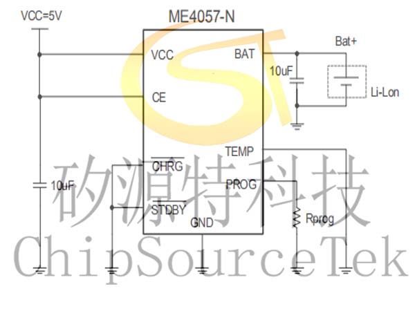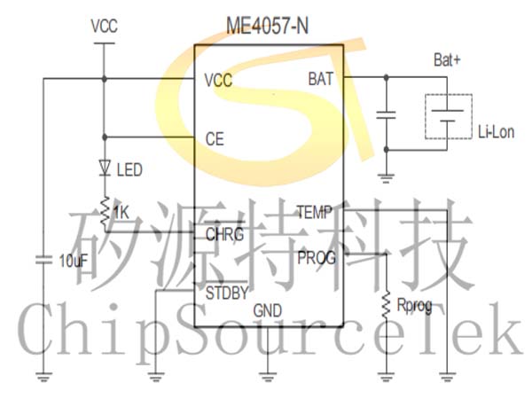 No external sense resistor is needed and no blocking diode is required due to the internal PMOSFET architecture .Thermal feedback regulates the charge current to limit the die temperature during high power operation or high ambient temperature .The charge voltage is fixed at 4.2V/4.34V/4.4V, and the charge current can be programmed externally with a single resistor. The ME4057-N automatically terminates the charge cycle when the charge current drops to 1/10ththe programmed value after the final float voltage is reached.