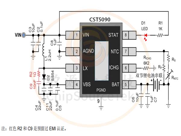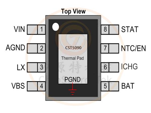 CST5090概要: CST5090是一款5V USB输入,最大1.6A充电电流, 支持双节锂电池串联应用的异步升压充电管理芯片,CST5090集成驱动MOS管,采用异步开关架构,使 其在应用时仅需要极少的外围器件,CST5090的升压开关充电转换器的工作频率为500KHz,转换效 率为90%。CST5090具备涓流充电、恒流充电、恒 压充电、自动截止、自动再充电等一套完整充电循环的充电管理芯片。