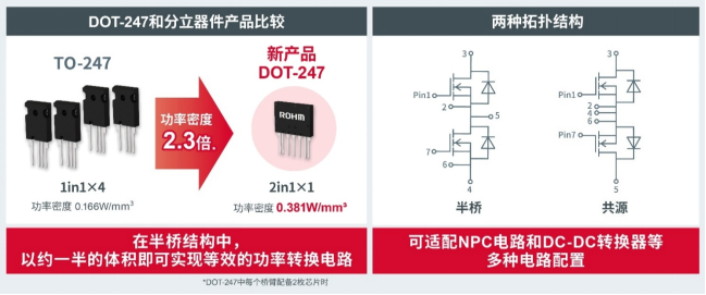 采用DOT-247的新产品有半桥和共源两种拓扑结构,可适配NPC电路*2和DC-DC转换器等多种电路配置。通过在这些配备多个分立器件的功率转换电路中使用该产品,可以减少元器件数量和安装面积,助力实现应用产品的小型化,并大幅削减安装工时和设计工时。