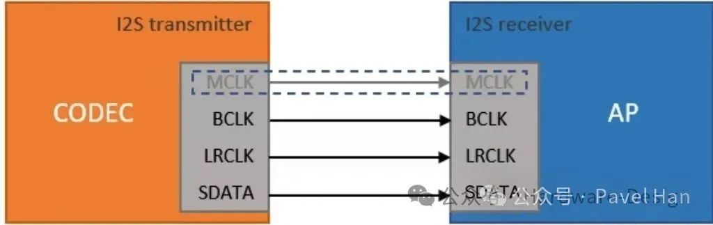 I2S(Inter-IC Sound)是一种同步串行接口,专门用于音频数据的传输,具有简单、高效和抗干扰能力强的特点。I2S接口传输的是数字音频数据,通常以PCM(脉冲编码调制)格式表示,实际上也就是Audio Codec中从麦克风采集语音数据经过AD转换后的数字音频数据,或者从DSP接收到的、需要通过Audio Codec进行DA转换后在扬声器播放出来的数字音频数据。