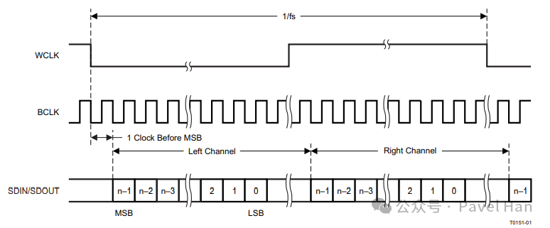 下图是TLV320AIC3101的I2S工作时序图。在I2S标准中,数据在WCLK边沿(上升沿或下降沿)延迟1个时钟周期(BCLK)后开始传输下一个声道的MSB数据位。
