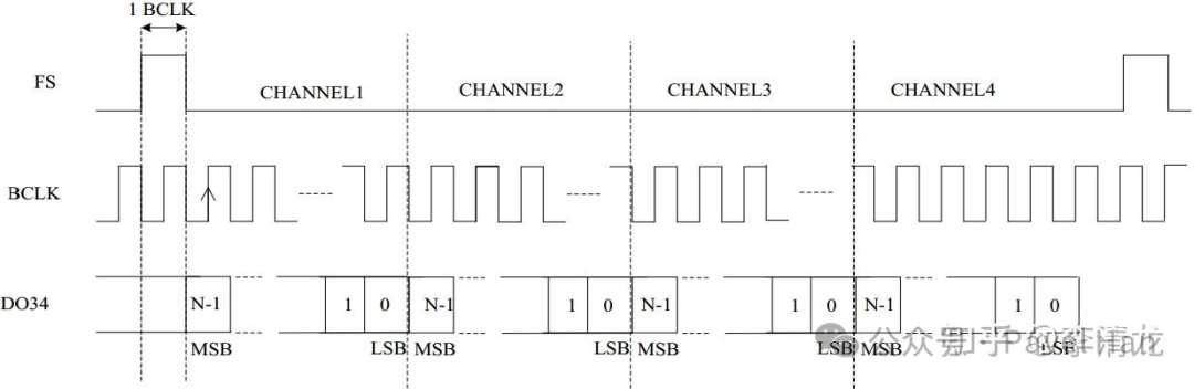 如下图所示的PCM接口连接的四通道音频传输的示意图,一次PCM_SYNC(FS)的跳变启动一个PCM Frame的传输,一个PCM Frame包含四个独立通道的音频采样数据,每个通道的采样数据占据固定的时隙。
