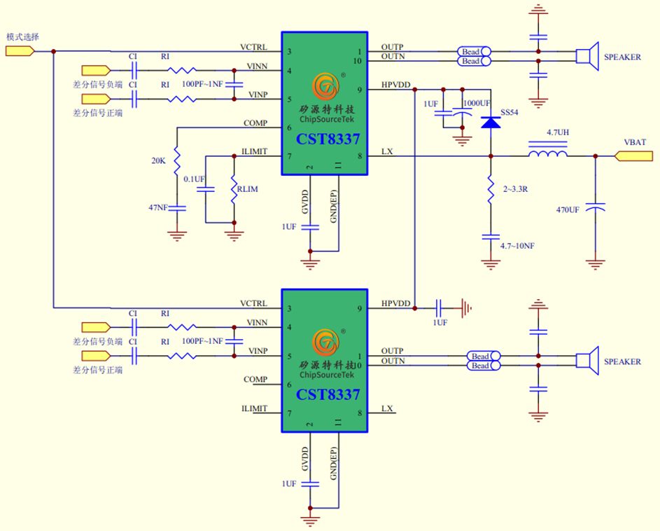 CST8337通过两个小体积、大功率自带升压单声道CST8337的搭配,利用其中一个的升压给另一个直接供电,在节省一套外围升压配套电路的同时,可以实现双声道自带 升压2X10W的功率,从而提供高性价比的立体声方案。