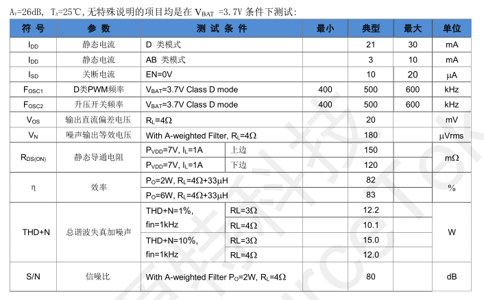 AV=26dB, TA=25℃,无特殊说明的项目均是在VBAT =3.7V条件下测试: