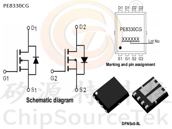 PE8330CG是N-Ch:VDS=30V, ID=30A,RDS(ON)<10.5mΩ@VGS=10V,RDS(ON)<18mΩ@VGS=4.5V;P-Ch:VDS=-30V, ID=-30A,RDS(ON)<22mΩ@VGS=-10V,RDS(ON)<30mΩ@VGS=-4.5V的N+P双通道增强模式电源Mosfet。提供DFN5x6-8L封装。