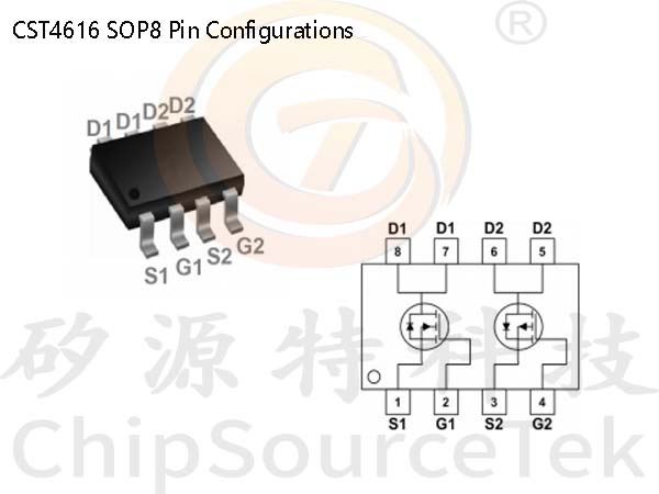 CST4616是N-Ch:BVDSS=30V,RDSON=18mΩ,ID=7A;P-Ch:BVDSS=-30V,RDSON=26mΩ,ID=-6A的N+P双通道快速切换Mosfet。提供SOP8封装。