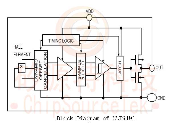 Using low power CMOS process, the CST9191 is designed for low power, high performance unipolar detection hall-effect application, such as cover switch,contactless switch, solid state switch and lid close sensor etc battery operation. The hall IC integrated an on-chip hall voltage generator for magnetic sensing, a comparator that amplifiers the hall voltage, a Chopper amplifier, a Schmitt trigger to provide switching hysteresis for noise rejection, and a complementary output.